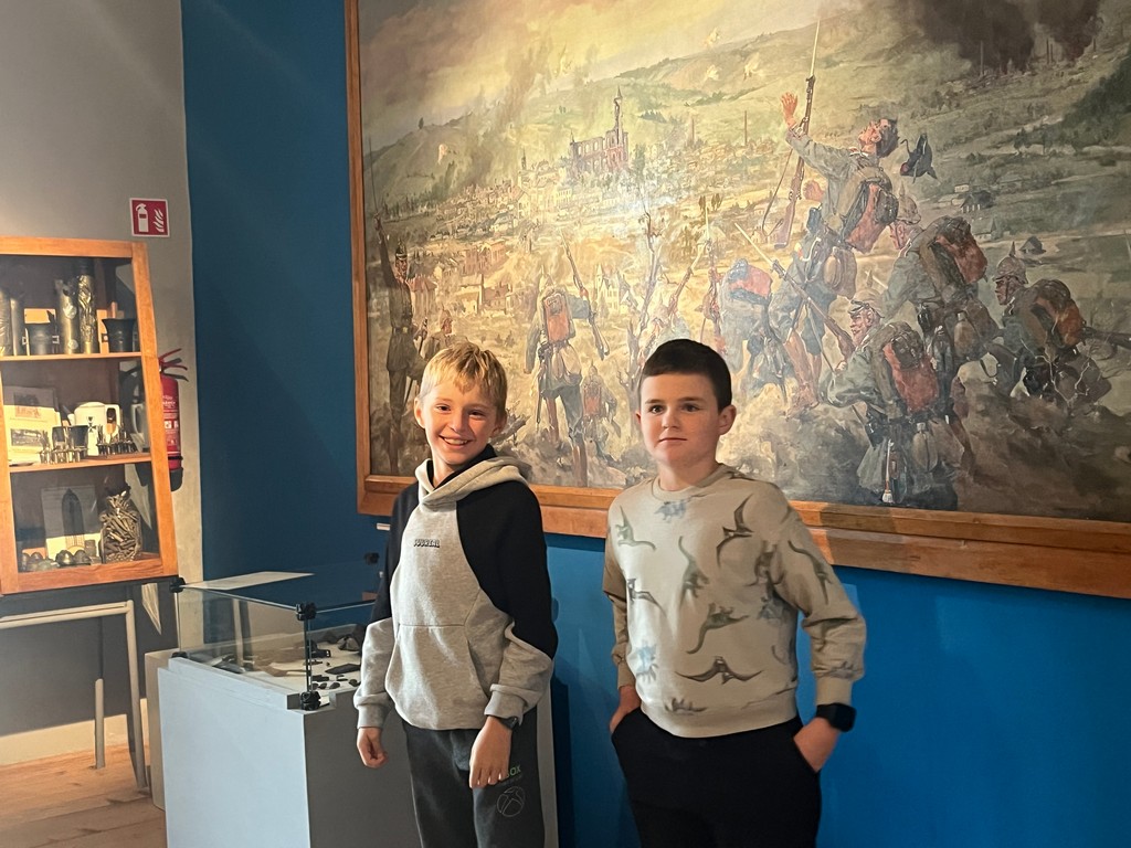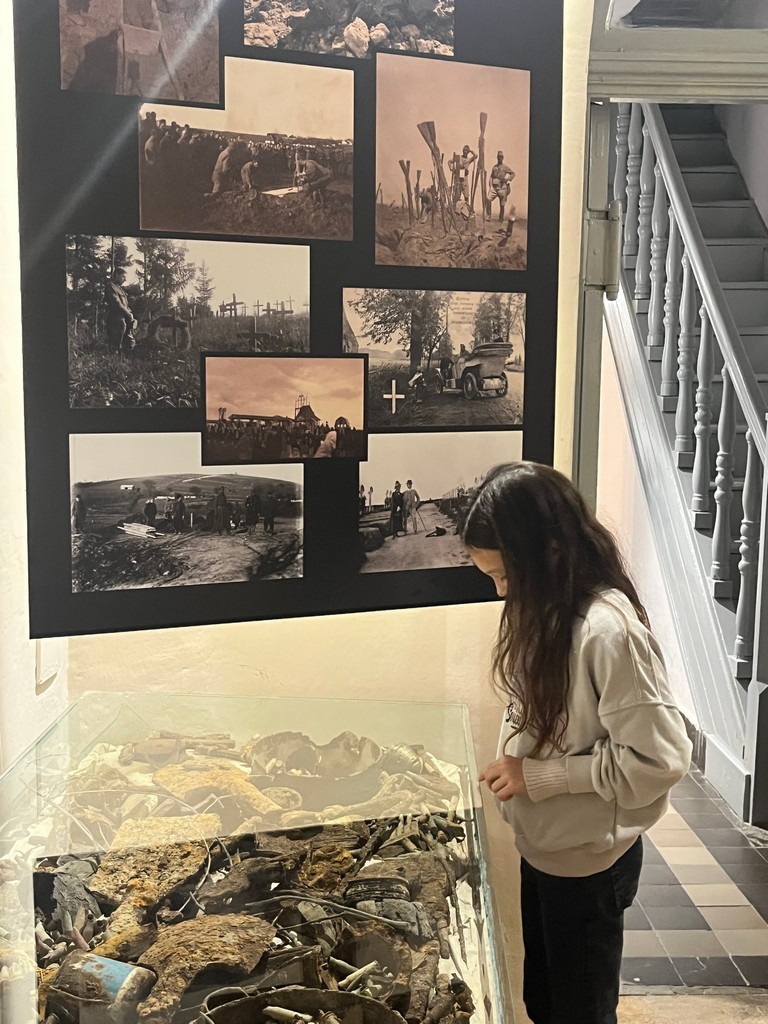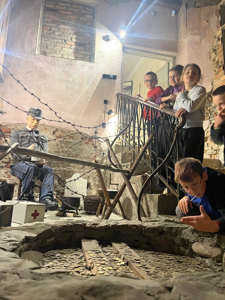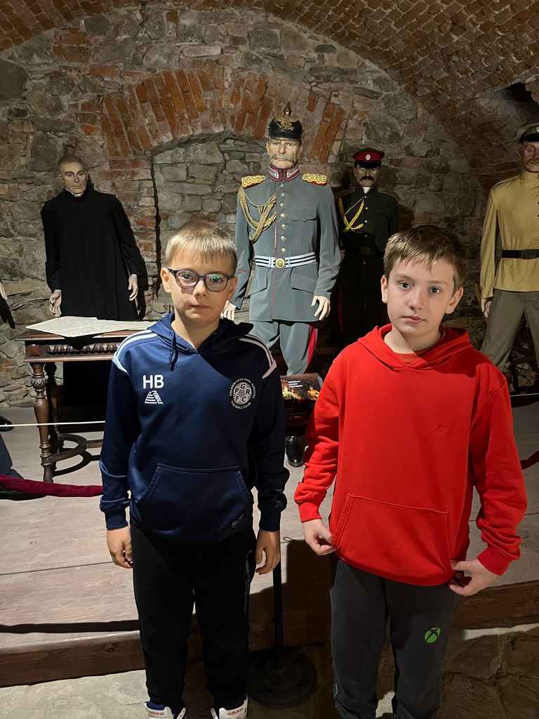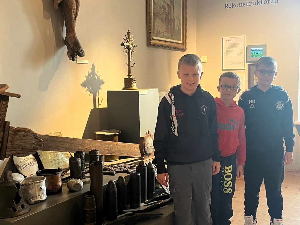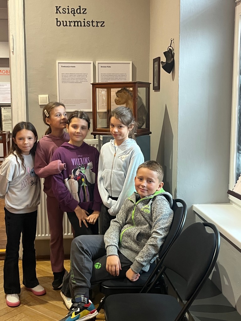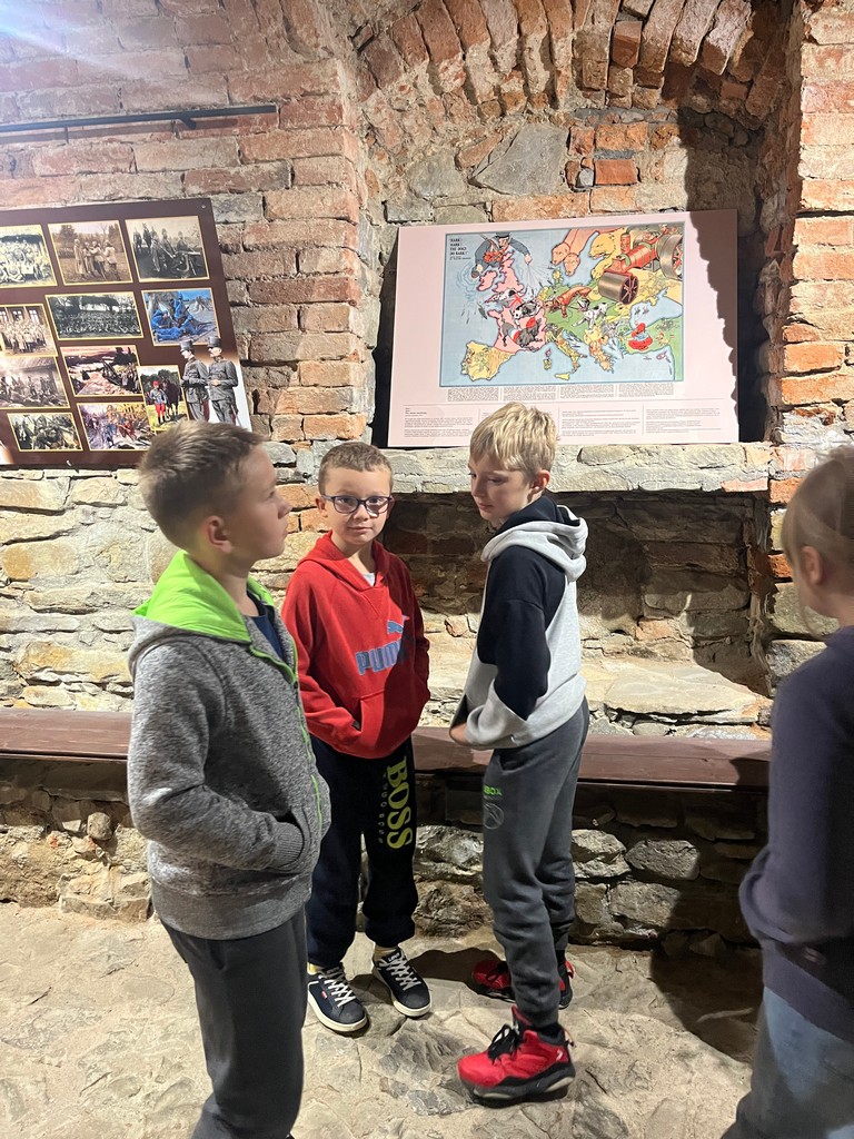 W murach Muzeum Regionalnego PTTK w Gorlicach 22 października przywitała klasę IIIa pani przewodnik i zaprosiła na spotkanie z historią. W niezwykle ciekawy sposób przybliżyła wydarzenia bitwy pod Gorlicami, która rozegrała się 2 maja 1915 r. Spacerując po poszczególnych salach muzeum dzieci zobaczyły zbiory broni, medale, umundurowanie żołnierzy i różne dokumenty z tego okresu. Ich ciekawość historyczną rozbudziła makieta bitwy gorlickiej, a ciekawość przyrodniczą postać księdza Bronisława Świeykowskiego z jego kolekcją chrząszczy i ukochaną małpką Koko. Dużym zainteresowaniem cieszyły się naturalnej wielkości figury woskowe przedstawiające ważne historycznie postacie z okresu I wojny światowej.